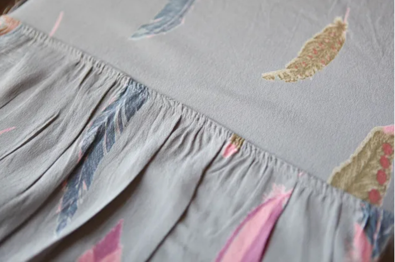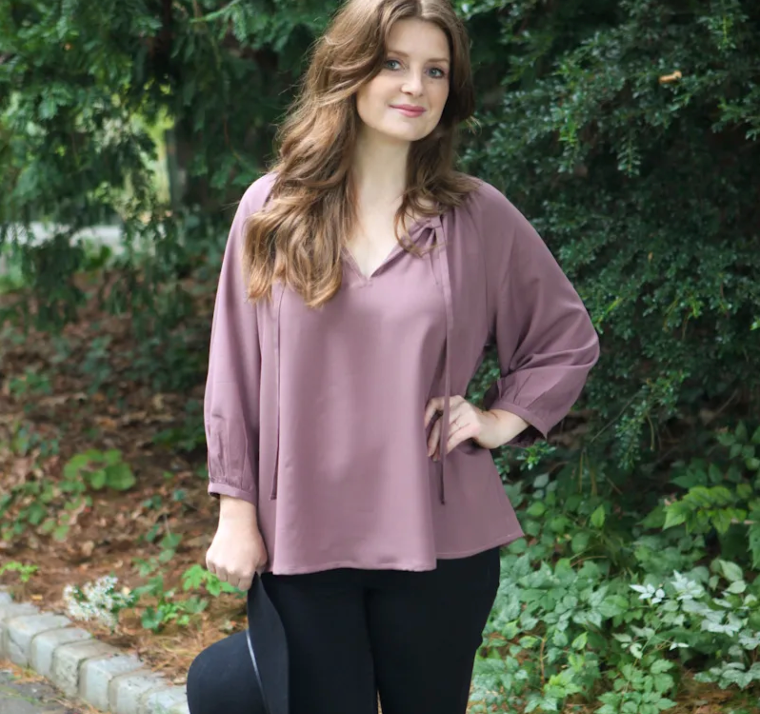 The Roscoe Blouse and Dress is a blouse or dress with a gathered neckline and raglan sleeves.The neckline is finished with a center slit and neckties. The sleeves are designed to hit a few inches above the wrist. View A is a blouse, view B is a mini dress or tunic and view C hits mid-calf. Views B and C have a large ruffle at the bottom.